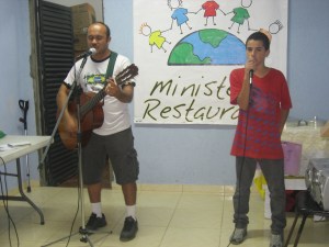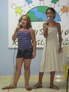 Promorar has a church that meets on Saturday nights. We would love to establish churches in each of the favela communities we work in. This is not an easy task! As we are developing relationships in these communities, people are meeting Jesus! But the relationship can’t stop there! We do follow up visits and pray with them in their homes, doing bible studies and meeting together on a regular basis. It is our prayer that God would raise up Pastors to shepherd the people in these communities. Promorrar is the first of these satelite churches. This weekend, Scott Hanson was the guest speaker for the service. Pastor Antonio led worship with Fabiano, a 12 yr old, adopted by a family from Promorrar. We also had a special performance by Racquel (left) and Nicole (right).