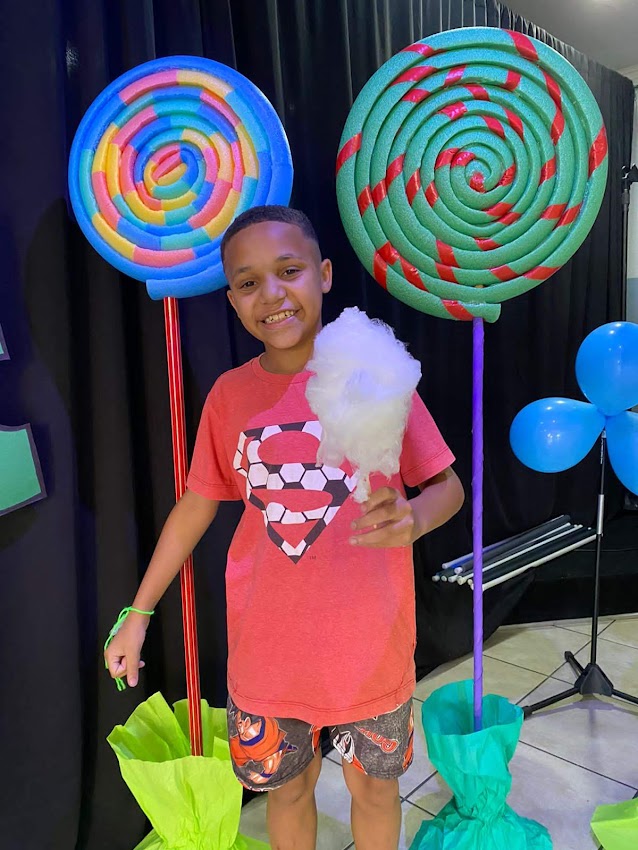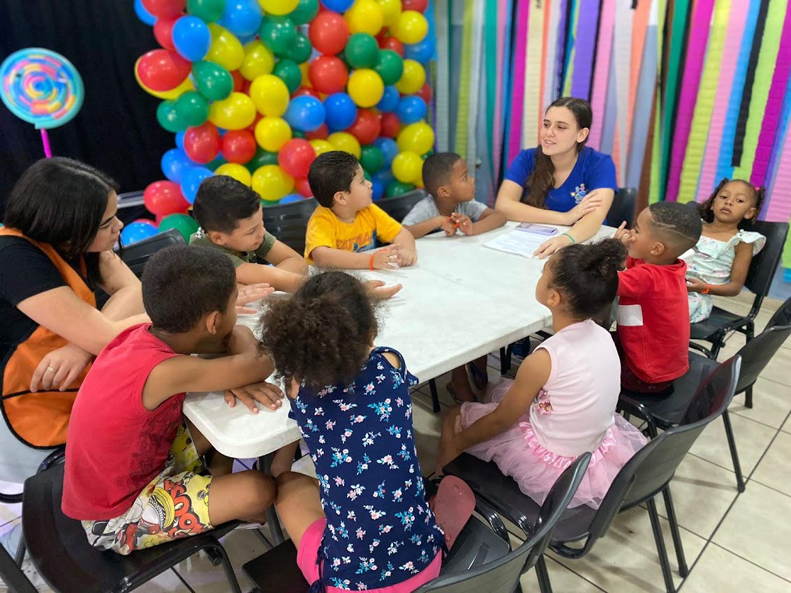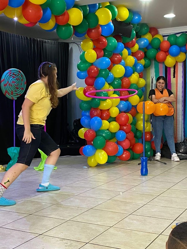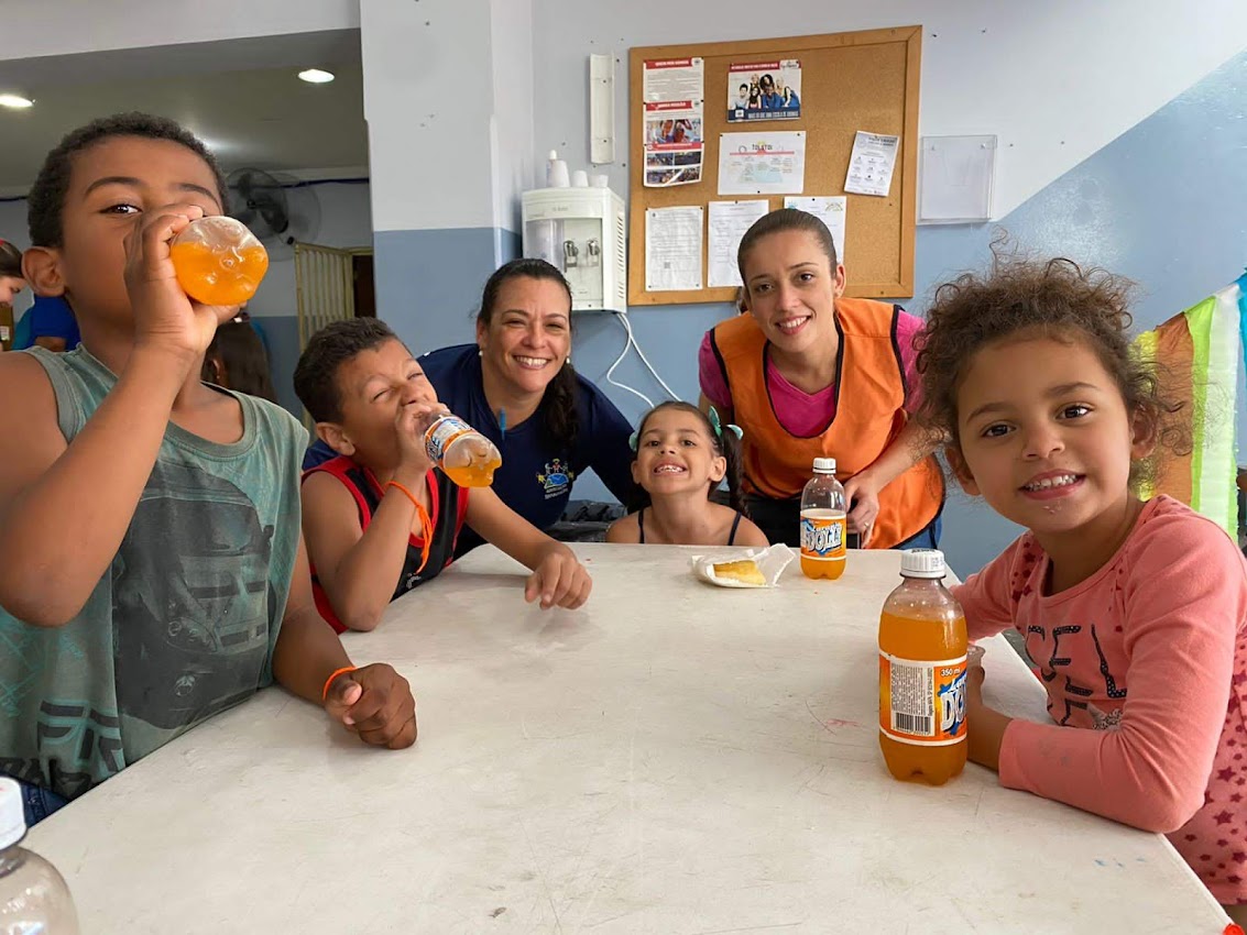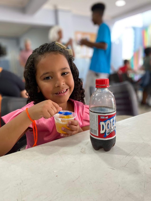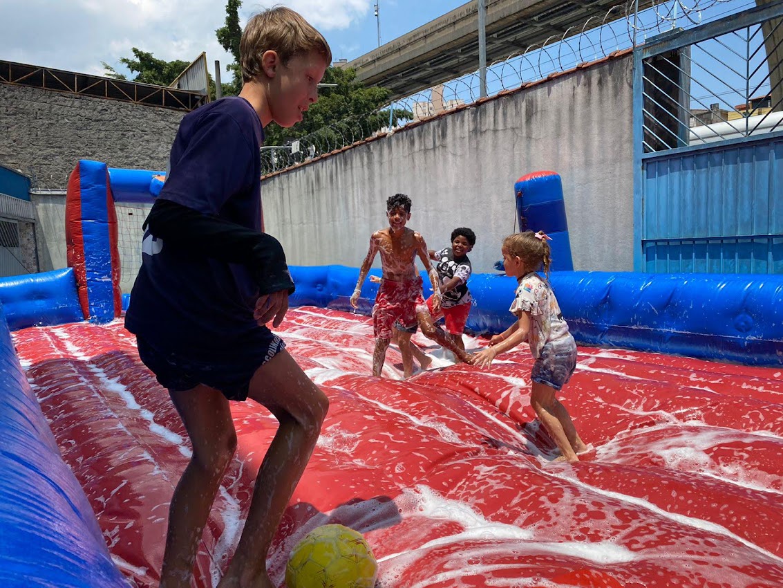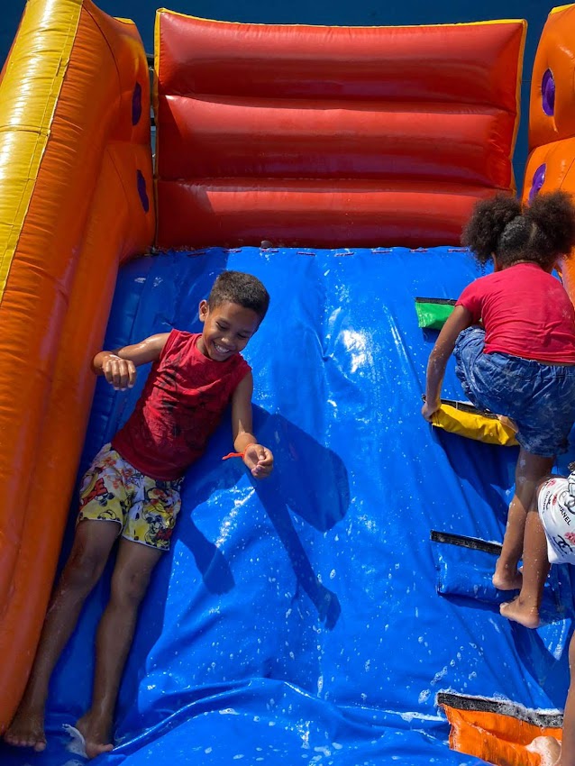 Our party had a delicious snack “Hamburgão” ( big hamburger ) sodas, snacks and popsicle for dessert. After dancing, all children watched a skit related to the theme, they had a moment of application (devotional) and prayer, then they had a snack and dessert to finally play on the inflatable toys that they love.